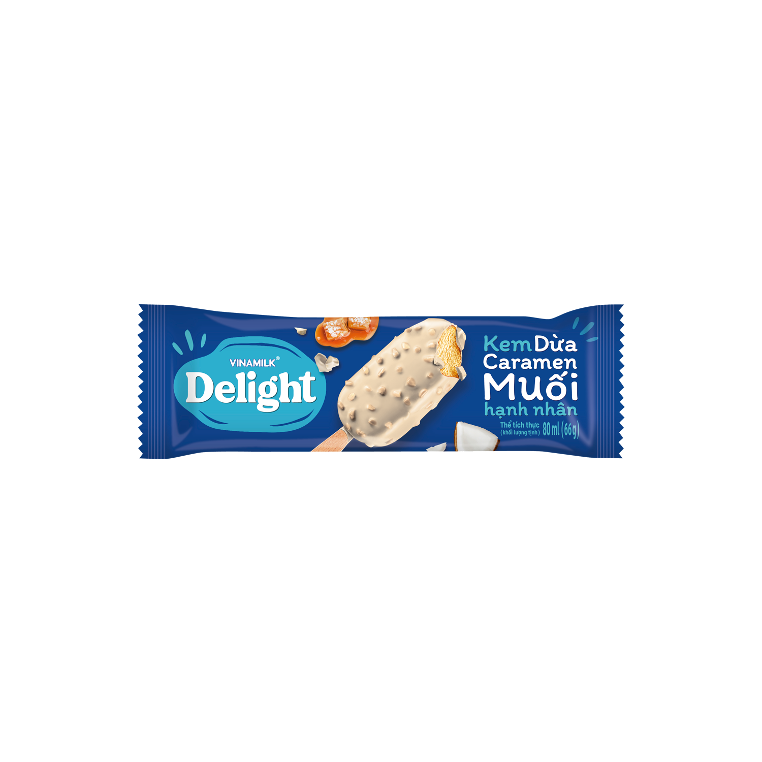 Sự hòa quyện giữa kem sữa dừa thơm béo và vị mặn-ngọt từ Caramel muối cùng lớp vỏ giòn phủ đầy hạnh nhân chỉ vỡ từng mảng nhỏ khi cắn, Kem sữa Delight giúp các bạn trẻ tự thưởng bản thân sau những giờ học và làm việc hăng say.